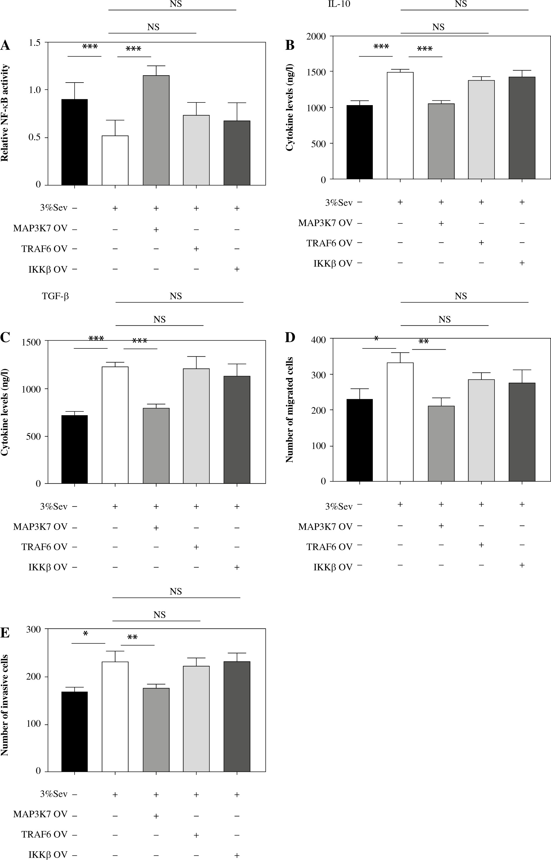 Next, we performed luciferase reporter assay in HEK293T cells to monitor the NF-κB activity, finding that 3%Sev decreased the NF-κB activity, which was reversed by MAP3K7 overexpressing plasmid (MAP3K7-OV), independent of TRAF6 or IKKβ overexpressing plasmid (TRAF6-OV and IKKβ-OV) (Fig. 3A). Meanwhile, we pre-transduced MAP3K7, TRAF6 or IKKβ overexpressing lentivirus (MAP3K7-OV, TRAF6-OV or IKKβ-OV) into the M2 THP-1 cells, with or without subsequent 3%Sev exposure to determine the regulatory effect of TRAF6, MAP3K7 and IKKβ on 3%Sev function. We found that 3%Sev-enhanced IL-10 and TGF-β (M2 marker) levels could be reversed by MAP3K7-OV, independently of TRAF6-OV or IKKβ-OV (Fig. 3B, C). Further, we cocultured Hela cells with indicated M2 conditional media which were harvested from the above M2 THP-1 cells. We found that the cell migration and invasion (Fig. 3D, E) of Hela cells, which were increased in the 3%Sev group, could be reversed in the MAP3K7-OV group, but could not be regulated in the TRAF6-OV or IKKβ-OV group. Collectively, these results indicated that 3%Sev inhibits NF-κB signaling activation in M2 macrophages, and MAP3K7, but not TRAF6 and IKKβ, mediates NF-κB signaling and M2 polarization alternation regulated by 3%Sev.