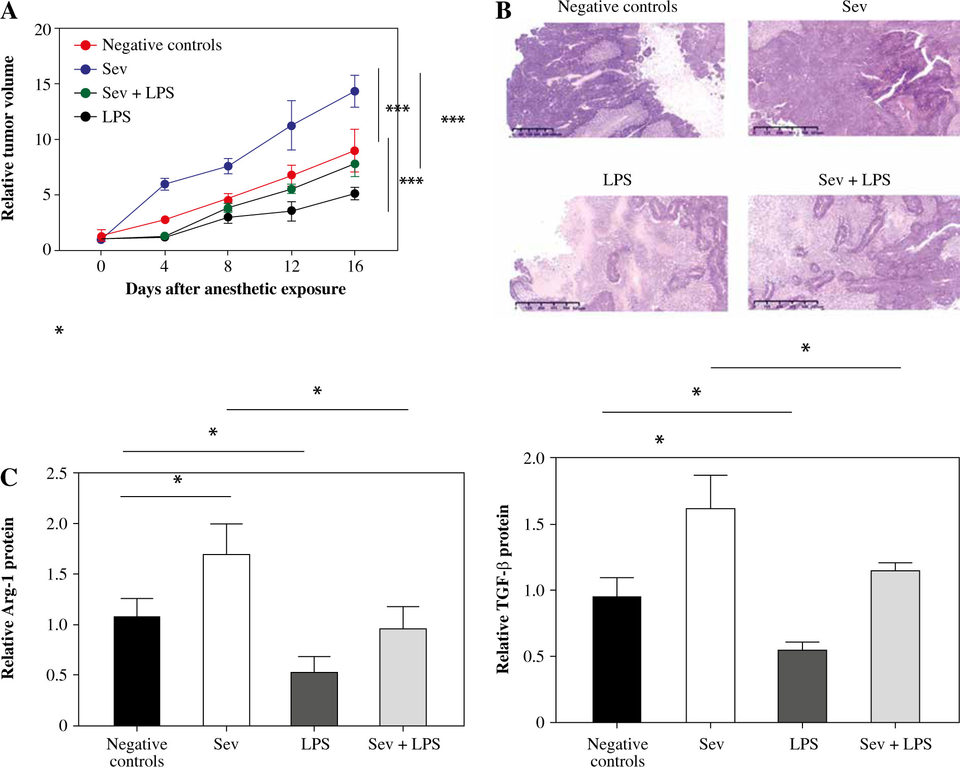 Sev promotes cervical cancer (CC) cell growth and TAM M2 polarization in vivo. Female Balb/c nude mice were inoculated subcutaneously with HeLa cells (1.0 × 106 cells/mouse) in the right armpit. The mice were grouped as the negative control group, Sev group, LPS group and Sev + LPS group according to the specific treatment described in materials and methods section. A) Tumor volume development among the groups after anesthetic exposure; B) H&E staining of tumor tissue sections among the groups after anesthetic exposure; C) Comparison of specific M2 markers Arg-1 and TGF-β among the groups at the endpoint of the experiments. Data are expressed as mean ± standard deviation. Each group includes 8 mice. *p < 0.05, **p < 0.01, ***p < 0.001