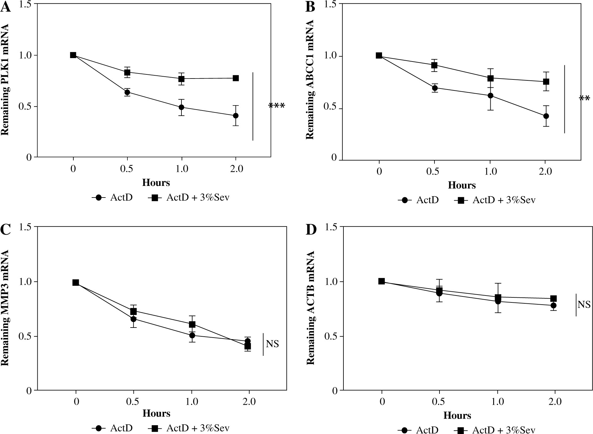 The mRNA levels may be induced transcriptionally or post-transcriptionally [21]. Post-transcription regulation was tested using the transcription inhibitor actinomycin D (ActD) in M2 THP-1. The TRAF6, MAP3K7 and IKKβ transcripts decayed significantly (Fig. 4A-C), while the control ACTB decayed little within 4 hours of ActD treatment (Fig. 4D). Treatment with 3%Sev 3 hours prior to ActD addition significantly accelerated TRAF6 and MAP3K7 mRNA decay (Fig. 4A, B). In contrast, we observed little effect of 3%Sev on IKKβ decay (Fig. 4C).