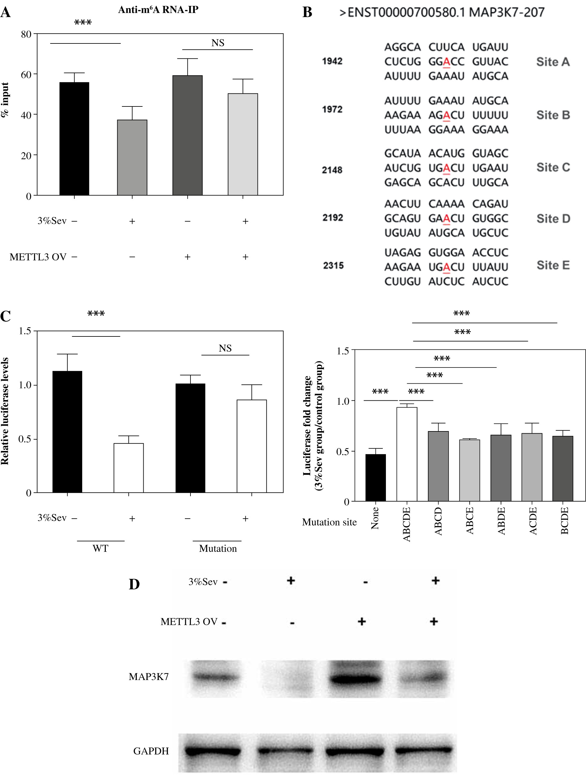 Using the SRAMP program [23], we predicted that MAP3K7 carries five potential m6A methylation sites (Fig. 5B). We constructed a luciferase reporter containing WT MAP3K7 3' UTR, or the mutant of all five m6A sites (ABCDE), and performed the luciferase reporter assay in HEK293T cells. The luciferase levels of the WT MAP3K7 3' UTR group (lacking mutation sites) were significantly decreased in response to 3%Sev, with a decrease rate of approximately 60%. This down-regulation was significantly weakened in the mutant group (ABCDE) (Fig. 5C). We mutated 4 m6A sites in different combinations (leaving one unchanged), and tested the fold changes in luciferase levels between 3%Sev and control groups. The fold changes in groups with ABCD, ABCE, ABDE, ACDE, and BCDE mutants were all higher than in the ABCDE mutant group (Fig. 5D). These results indicated that all five m6A sites were modified by 3%Sev. Next, we performed western blotting assay in M2 THP-1 and found that MAP3K7 was lower in 3%Sev treatment, compared with the control group. Meanwhile, pre-transducing with METTL3 overexpressing lentivirus could enhance the MAP3K7 levels in both 3%Sev and control groups equally efficiently, confirming that 3%Sev regulated the MAP3K7 levels through the METTL3/m6A pathway (Fig. 5E).