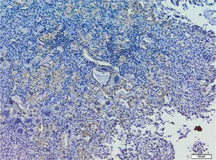 The tissue material was prepared according to the standard histological procedure. Slides for histopathological evaluation were stained with hematoxylin and eosin.