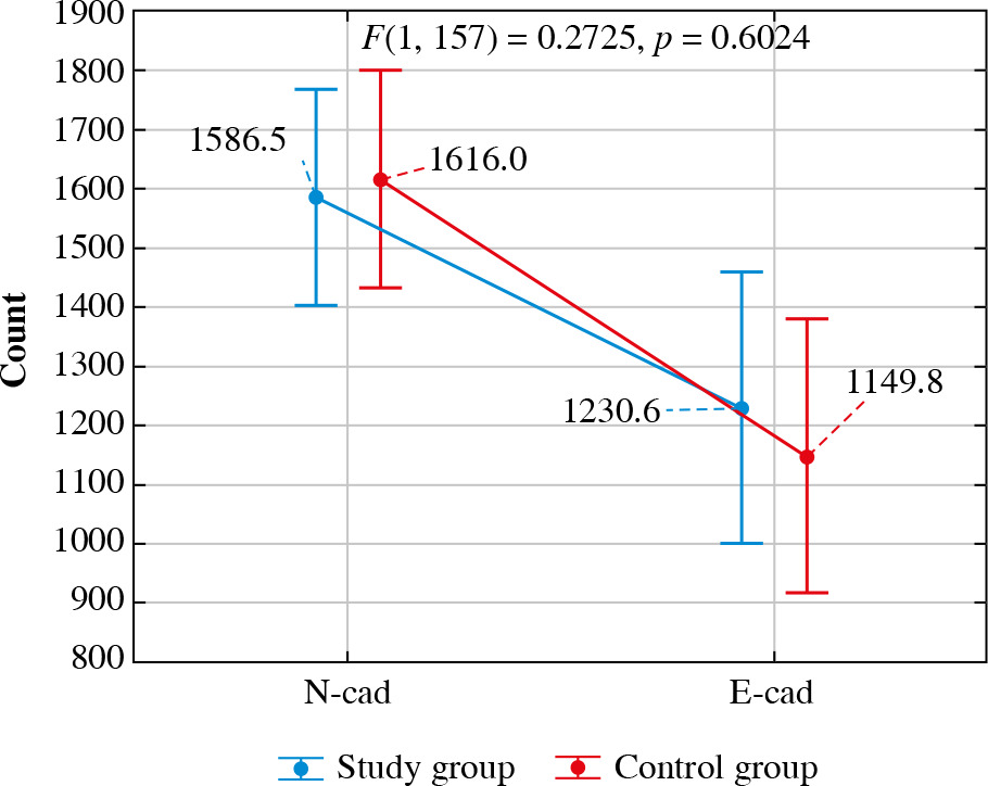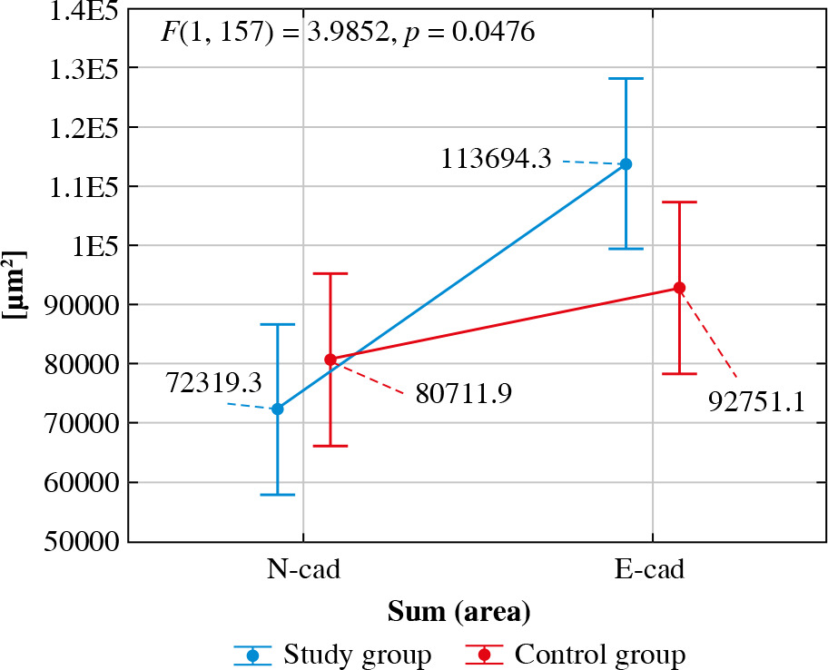 The interaction effect between group and type of immunohistochemical reaction for the Sum (Area) variable was statistically significant (F(1, 157) = 3.99, p = 0.047) – the immunohistochemical reaction area for N-cadherin did not differ between the two groups (p = 0.270), while the immunohistochemical reaction area for E-cadherin was significantly larger in the test group than in the control group (p = 0.021). A significant difference between the immunohistochemical reaction areas was detected in the study group (p < 0.001). Moreover, the reaction area for N-cadherin was significantly smaller than that for E-cadherin. In the control group, no significant difference was detected between the immunohistochemical reaction area for N-cadherin and E-cadherin (p = 0.164). The strength of this interaction effect was η2 = 0.02, which indicated a weak effect of the confirmed interaction (Fig. 5).