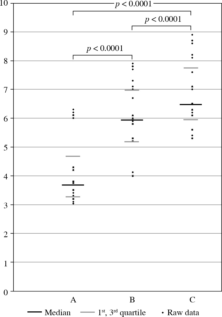 The distribution of variables in the study group of the patients with head and neck cancer checked with the use of the Shapiro-Wilk test showed that each of the patients was different from normal. The statistically significant differences between the groups were determined by the Kruskal-Wallis test, and one-way analysis of variance by ranks. The Mann-Whitney U test was then used as applicable. All statistical analyses were carried out with the Statistica 8.0 software program (StatSoft Inc., Tulsa, OK, USA). A p-value < 0.05 was considered indicative of a statistically significant difference.