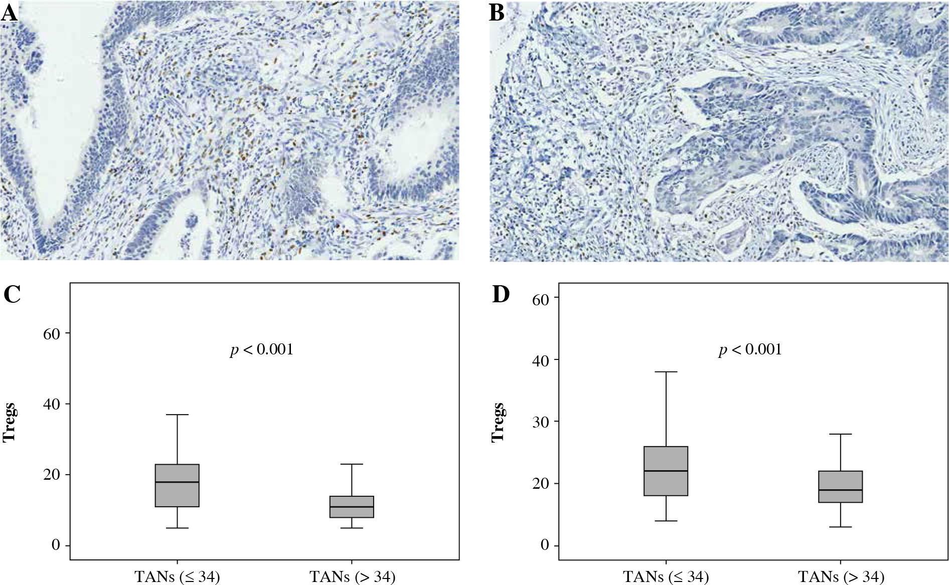 A negative correlation between the numbers of FoxP3+ Tregs and CD66b+ TANs, CD66b+ TANs and CD163+ TAMs, and a positive correlation between the number of FoxP3+ Tregs and CD163+ TAMs in CRC tissues was observed in this study. To our knowledge, this is the first time that the infiltration relationship among FoxP3+ Tregs, CD66b+ TANs and CD163+ TAMs has been studied in CRC.