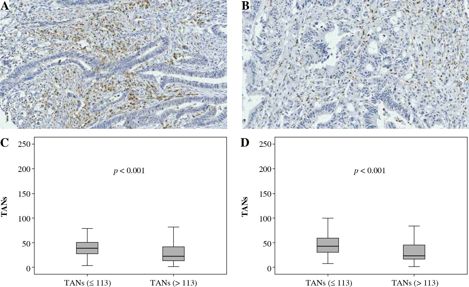 Association between CD66b+ TAN infiltration and CD163+ TAM infiltration. A, B) Immunohistochemically stained sample for high-level and low-level CD66b+ TANs (400×). Plots of CD66b+ TANs for two CD163+ TAMs groups in training cohort (C) and validation cohort (D). Samples were divided into two group according to the median value of CD163+ TAM number in the training cohort, and the comparison between two groups was analyzed using the Mann-Whitney u test