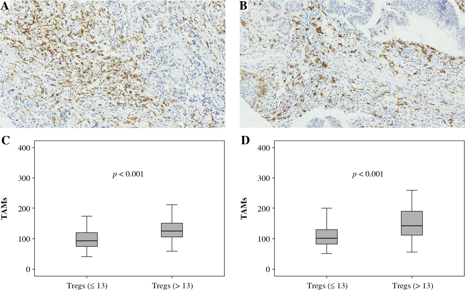 Association between FoxP3+ Treg infiltration and CD163+ TAM infiltration. A, B) Immunohistochemically stained sample for high-level and low-level CD163+ TAMs (400×). Plots of CD163+ TAMs for two FoxP3+ Treg groups in training cohort (C) and validation cohort (D). Samples were divided into two groups according to the median value of FoxP3+ Treg number in the training cohort, and the comparison between two groups was analyzed using the Mann-Whitney u test
