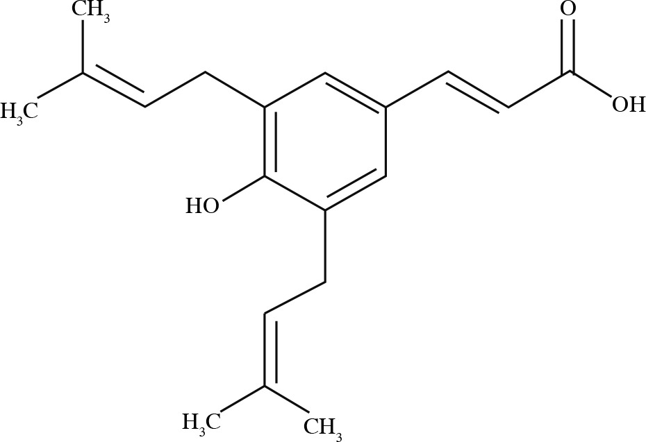 The biological activities of Brazilian green propolis result from the high levels of prenylated p-coumaric acids, mainly artepillin C (3,5-diprenyl-p-coumaric acid) [23]. The structure of artepillin C is shown in Figure 2.
