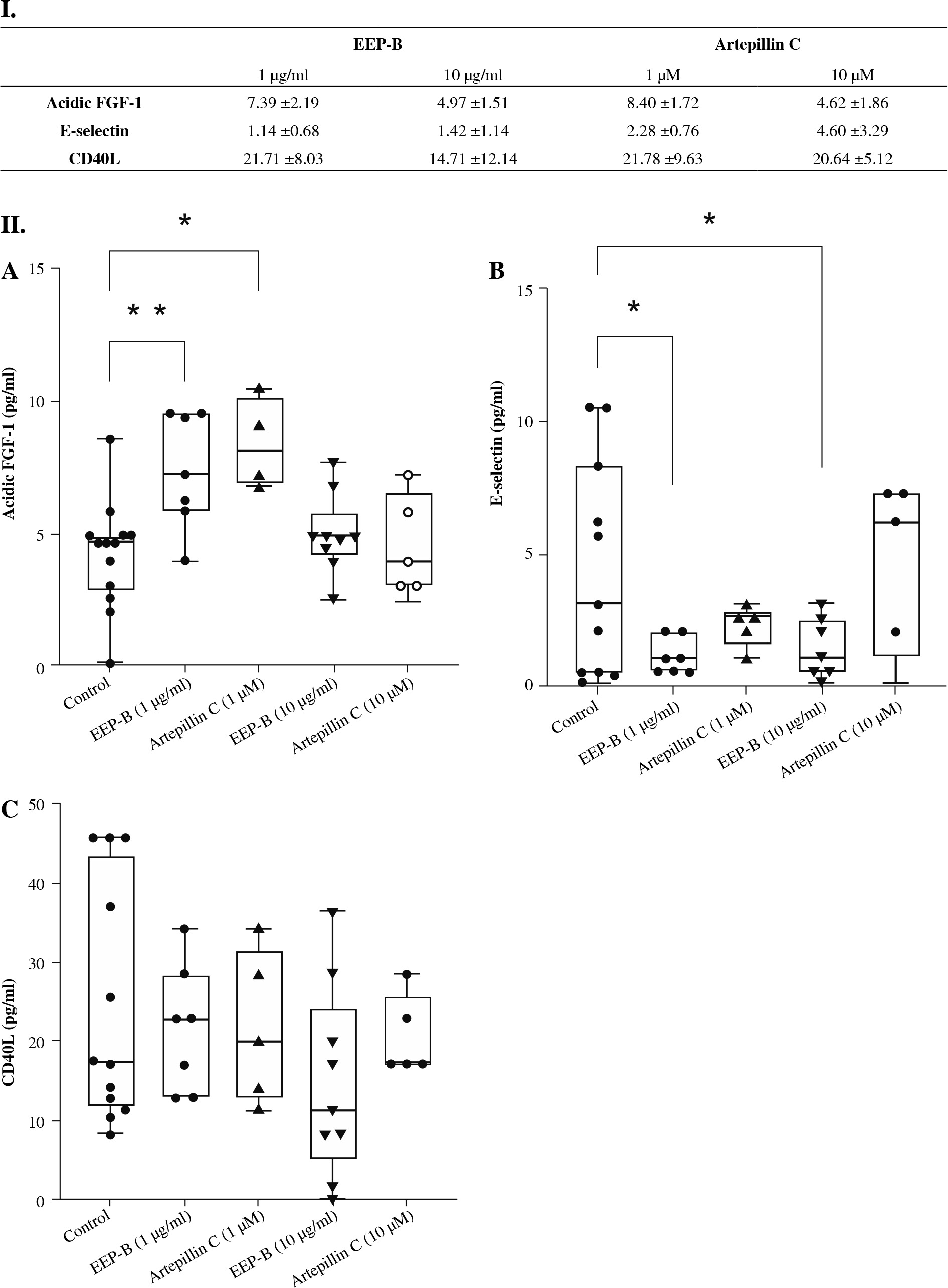 I. Mean and standard deviation of tested parame- ters; II. Effect of ethanolic extract of Brazilian green prop- olis and artepillin C on aFGF-1 (A), E-selectin (B), and CD40L (C) secreted by human gingival fibroblast (n = 8, *p < 0.05, **p < 0.01)