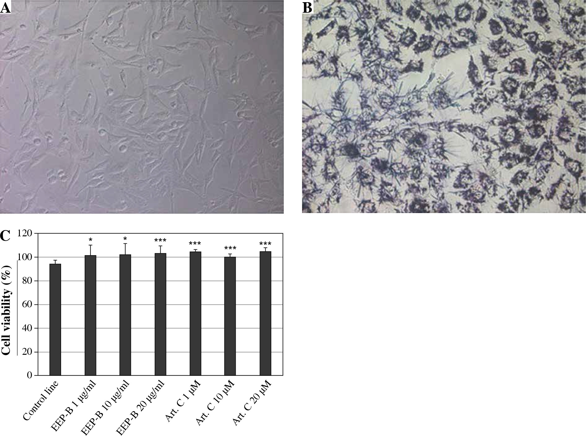 Cytotoxic activity of EEP-B and artepillin C on HGF-1 cells. A) HGF-1 cells (magnification 200×), B) HGF-1 cells incubated with MTT tetrazolium for 4 hours showing formazan crystals (magnification 200×), C) Cell viability (%). Cytotoxic activity of artepillin C and Brazilian green propolis on HGF-1 cells. The cells were incubated for 24 hours with artepillin C at the concentrations of 1-20 μM and with Brazilian green propolis at the concentrations of 1-20 μg/ml. The cell viability was measured by MTT cytotoxicity assay. The values represent mean ±SD of three independent experiments in quadruplicate (n = 12); *p < 0.005, **p < 0.01, ***p < 0.001