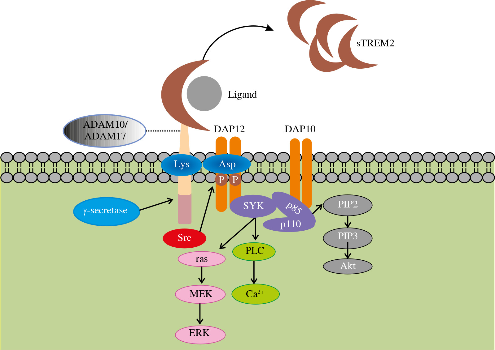 Structure of TREM2 and related signaling pathway. After binding to the ligand, the extracellular domain of TREM2 transmits a relevant signal to its associated DAP12 via the lysine residue in its transmembrane domain followed by the phosphorylation of immunoreceptor tyrosine-based activation motif (ITAM) in DAP12. This process leads to the activation of spleen tyrosine kinase (SYK) thus activating a cascade of downstream signaling pathways, including phospholipases C (PLC) activation induced calcium ion mobilization and activated Ras gene mediated extracellular regulated protein kinase (ERK) activation