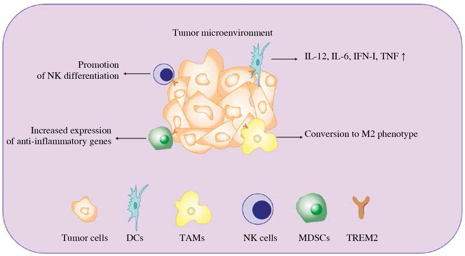 TAM receptors such as Tyro3, Axl and Mer promote M2-like macrophage formation in TME [59]. It is possible that TREM2 can interact with these receptors to promote TAM maturation by recognizing lipids, apolipoproteins, and apoptotic fragments released in TME.