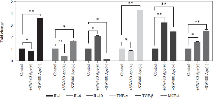The expression levels of cytokines in macrophages, which were co-cultured with apelin gene-suppressed SW480 cells, were examined via qRT-PCR analysis, and the relative fold changes are illustrated in Figure 4. IL-1 expression was significantly lower in the presence of apelin, while it was significantly higher in the absence of apelin compared to the control (p < 0.05; Fig. 4). Although IL-6 expression level was non-significantly downregulated in the presence of apelin, it was significantly upregulated in the apelin-knockdown cells (p < 0.05). Gene expression changes of both pro-inflammatory cytokines indicated that macrophage cells change the cytokine profile in response to apelin absence. Similarly, the expression levels of TNF-α and TGF-β were higher in apelin-suppressed cells compared to control cells. The TNF-α level was lower (p < 0.05) while the TGF-β level was significantly higher (p < 0.01) in the presence of apelin compared to the control (Fig. 4). MCP-1, which is an effective cytokine in the recruitment of macrophages, was dramatically upregulated regardless of the presence (p < 0.05) or absence (p < 0.01) of apelin (Fig. 4).