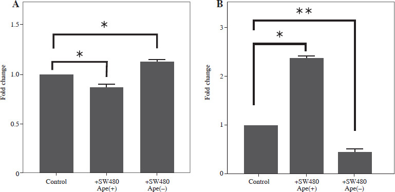 Gene expression levels of cell surface markers after co-culture of macrophage cells with ape (+) and ape (–) SW480 cells were detected via qRT-PCR analysis. Although CD86 expression was significantly lower in macrophages co-cultured with the ape (+) group, CD163 expression was higher in the presence of apelin as compared to control cells (p < 0.05; Fig. 5). In the ape (–) group, where apelin was suppressed, CD86 was significantly higher (p < 0.05), while CD163 was significantly lower (p < 0.01) compared to control cells (Fig. 5).