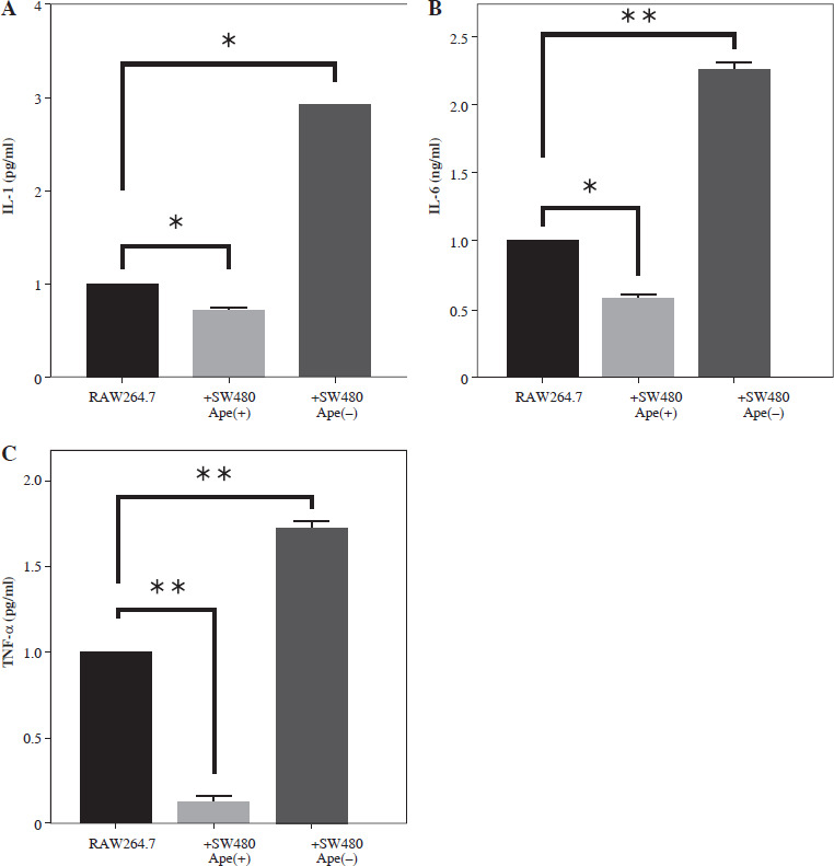 The expression levels of interleukin (IL)-1 and IL-6 at the protein level were lower in RAW264.7 macrophage cells co-cultured with ape (+) cells compared to control cells (p < 0.05; Fig. 6). However, IL-1 and IL-6 protein levels were higher in RAW264.7 cells co-cultured with SW480 cells in which the apelin gene was suppressed (p < 0.01; Fig. 6). Similarly, tumor necrosis factor α (TNF-α) protein levels were also lower in the presence of apelin (p < 0.01) and higher in the absence of apelin (p < 0.01) compared to control cells (Fig. 6).