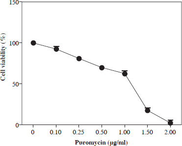 Previous studies showed that puromycin, a selective antibiotic for mammalian cells, is frequently and safely used at 2-10 µg/ml. In this study, kill curve analysis was performed for SW480 cells at and below this dose range, and doses of 2 µg/ml and above were found to be cytotoxic for all cells. However, it was determined that a dosage of 1.5-2 µg/ml can be applied as a selective dose in non-transduced SW480 cells (Fig. 1).