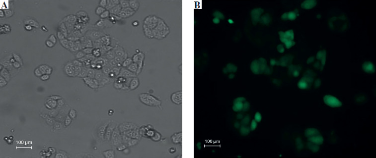Fluorescent microscopic examination of TurboGFP protein expression in transduced cells