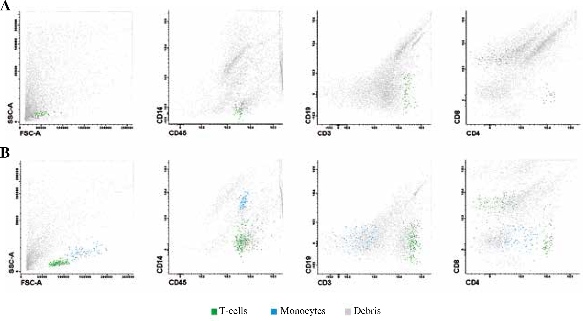 Flow cytometric image of a native (unfixed) CSF sample (A) and TransFix®-preserved CSF sample (B). Both sample aliquots were acquired after 24-hour storage at 4°C. In the unfixed CSF sample significant loss of monocytes (blue) and lymphocytes (green) is visible accompanied by significant increase in cellular debris (grey) [own data]