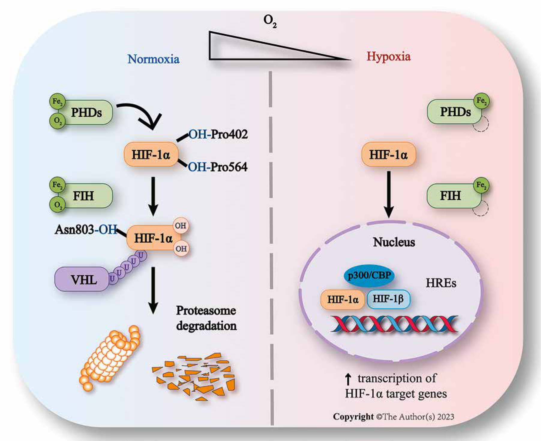 Prolyl hydroxylase domain proteins (PHDs) play a vital role in regulating HIF-1α and are mainly involved in HIF-1α degradation [8]. The family of PHDs consists of PHD-1, PHD-2, and PHD-3, with PHD-2 primarily targeting the N-TAD of HIF-1α [8]. Moreover, PHD-2 is the most critical enzyme for regulating the stability of HIF and its downstream target genes in rheumatoid arthritis synovial fibroblasts (RASF) [12]. A study conducted by Barbara Muz et al. showed that HIF-1α expression soared when PHD-2 was knocked out in human RA fibroblast-like synoviocytes (FLS) [13]. It is reasonable to believe that stabilization of PHD-2 expression may be a potential therapeutic approach towards RA. Under normoxic conditions, PHDs modify HIF-1α, requiring iron (Fe2+) as an enzyme cofactor, with α-ketoglutaric acid and oxygen as substrates [12]. Proline at two key positions (Pro564 and Pro402) on the HIF-1α protein is hydroxylated by PHDs. The modified HIF-1α can be recognized and bound by the tumor suppressor von Hippel-Lindau (vHL) and subsequently enter the ubiquitination process, which involves modification by the vHL degradation complex. Finally, HIF-1α is degraded through the 26S proteasome pathway[14]. The oxygen-rich environment can maintain the high activity of PHDs. However, under low oxygen conditions, the enzyme activity of PHDs decreases, making it difficult to complete the hydroxylation modification of HIF-1α, resulting in vHL being unable to recognize, bind, and degrade HIF-1α, leading to a significant buildup of HIF-1α within cells [15]. This accumulation can result in a series of physiological responses mediated by HIF-1α, which can lead to related diseases.