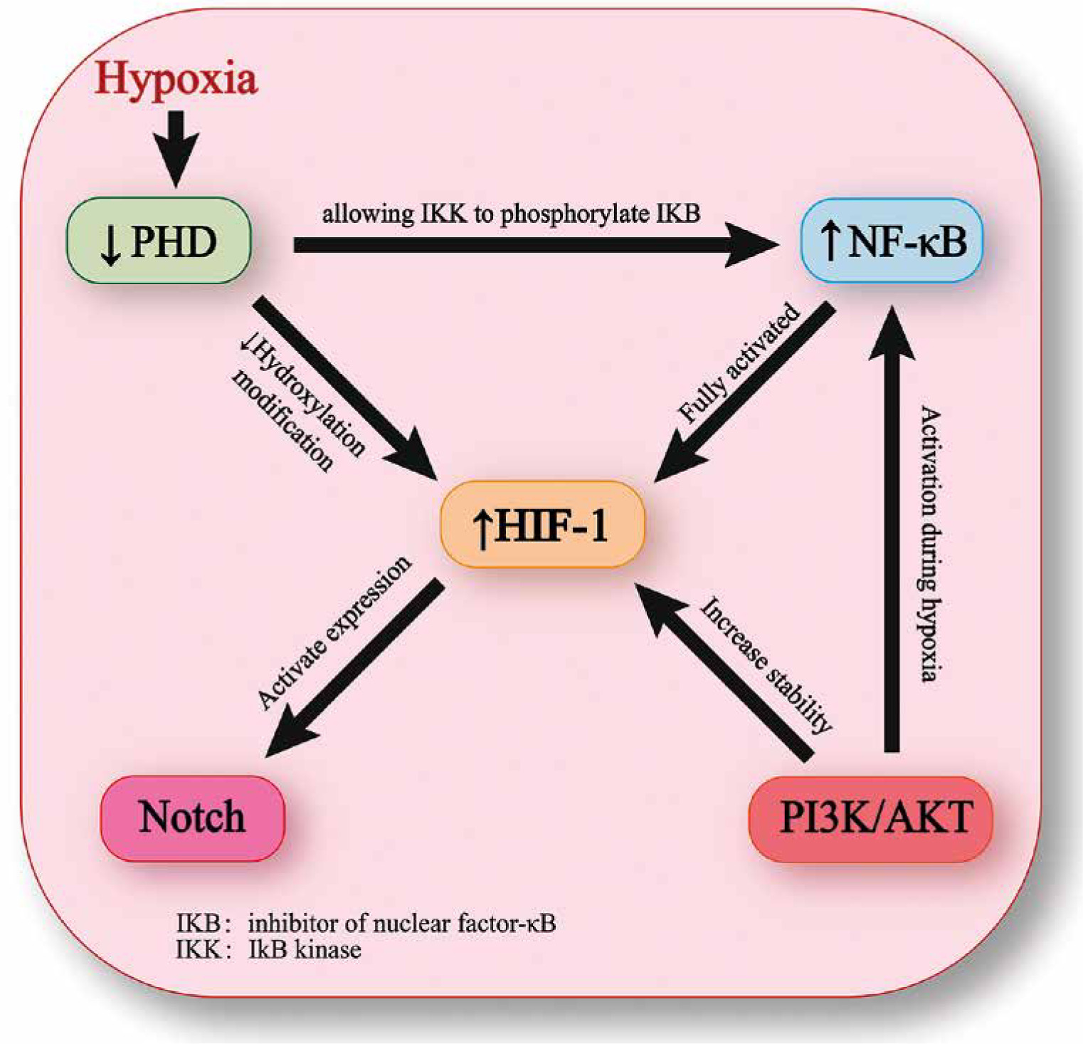 The Notch signaling pathway is a well-conserved mechanism of communication between cells, which plays a crucial role in coupling of bone formation with angiogenesis and osteogenesis [25]. The Notch signaling pathway in mammals involves four different receptors, namely Notch1-4 [26]. Direct interaction between HIF-1α and Notch intracellular domain (NICD) can occur. HIF-1α is recruited onto the transcriptional complex of NICD and binds to the corresponding promoter of Notch to activate the Notch target gene [27]. The expression of NICD is negatively correlated with oxygen levels in synovial tissue, and under hypoxic conditions, the invasion and angiogenesis in RA can be induced by the interaction between Notch1 and HIF-1α [28]. Blocking the Notch signaling pathway could potentially offer a novel therapeutic approach for RA by disrupting the biological functions of the HIF-1α protein [28].
