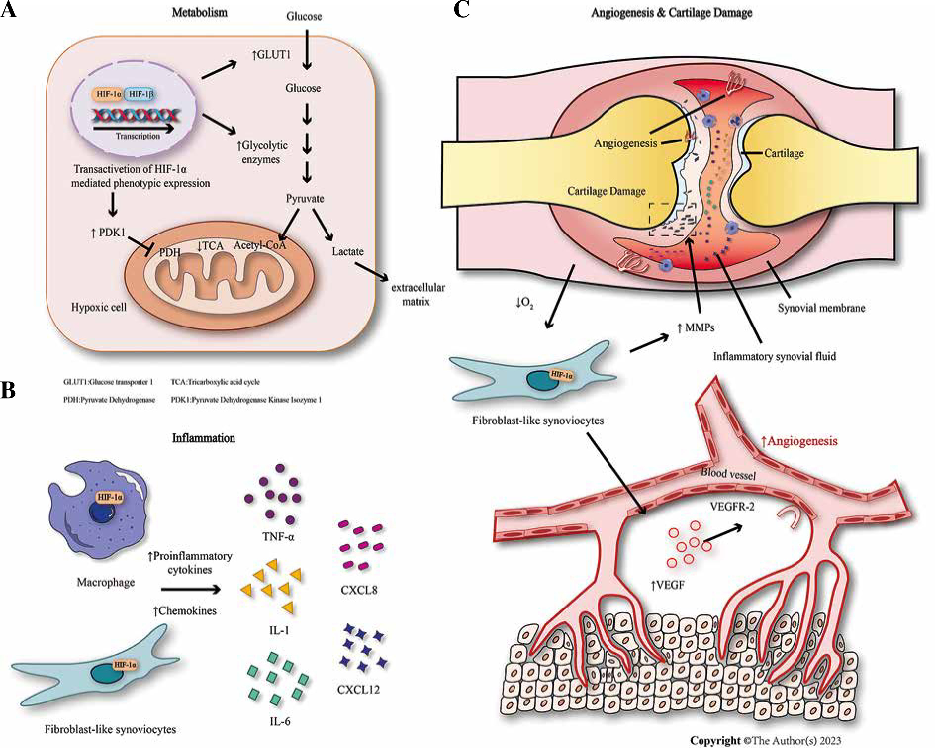Hypoxia-inducible factor-1 is an important transcription factor that responds to changes in oxygen concentration and can be induced by hypoxic environments. It is involved in various important biological reactions, such as converting the glucose metabolism of cells in a hypoxic environment from the tricarboxylic acid cycle (TCA) to glycolysis, due to which the cells are in a state of continuous differentiation in the state of hypoxia [10]. Furthermore, HIF-1 can stimulate angiogenesis by triggering the production of vascular endothelial growth factor (VEGF), which participates in angiogenesis and leads to many diseases [11]. HIF-1α also stabilizes chondrocytes, making them survive [4]. The functions of HIF-1 in RA are mainly in promoting inflammation, angiogenesis and cartilage destruction [4].