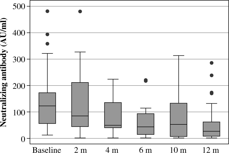The median level of neutralizing antibodies in the first measurement was 122 AU/ml; for the last measurement it was 26.5 AU/ml.