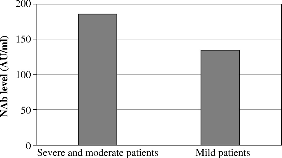 Ten patients (26.3%) had moderate or severe COVID-19 (they required hospitalization and oxygen therapy); 28 of the patients (73.7%) had mild symptoms of COVID-19. The mean level of neutralizing antibodies on first measurement was 134.5 AU/ml in the group of patients with mild symptoms and 186.4 AU/ml in the group of patients with a moderate or severe course of illness (Fig. 3).