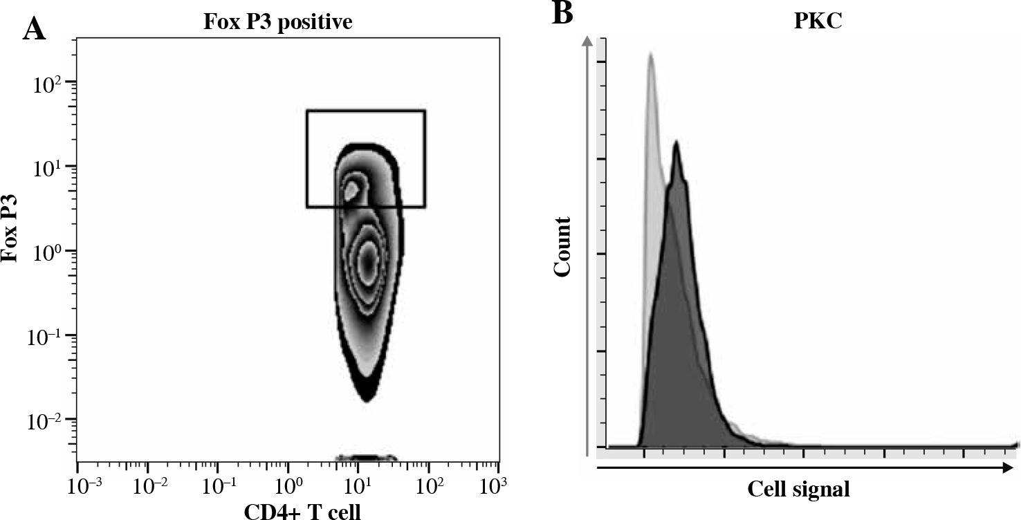 Non-specific binding was prevented employing Fc-block reagent (purified anti-mouse CD16/32 (93)) from BioLegend (San Diego, CA). Staining of the cell surface was performed with anti-CD4 mAb (GK1.5) from Miltenyi Biotec (Bergisch Gladbach, Germany). Identification of FoxP3+ cells was achieved employing anti-FoxP3 mAb (FJK-16s) from eBioscience (San Diego, CA). Intracellular signaling molecules were stained with primary antibodies including specific anti-PKC-δ (P632), anti-p-PKC-δ (Thr 538), anti-ZAP-70 (99F2) and anti-p-ZAP-70 (Tyr 493) purchased from Cell Signaling Technology (Danvers, MA). To enable detection, the Alexa Fluor 555 conjugated F(ab)'2 fragment of goat anti-rabbit IgG from Life Technologies (Carlsbad, CA) was employed as a secondary antibody.