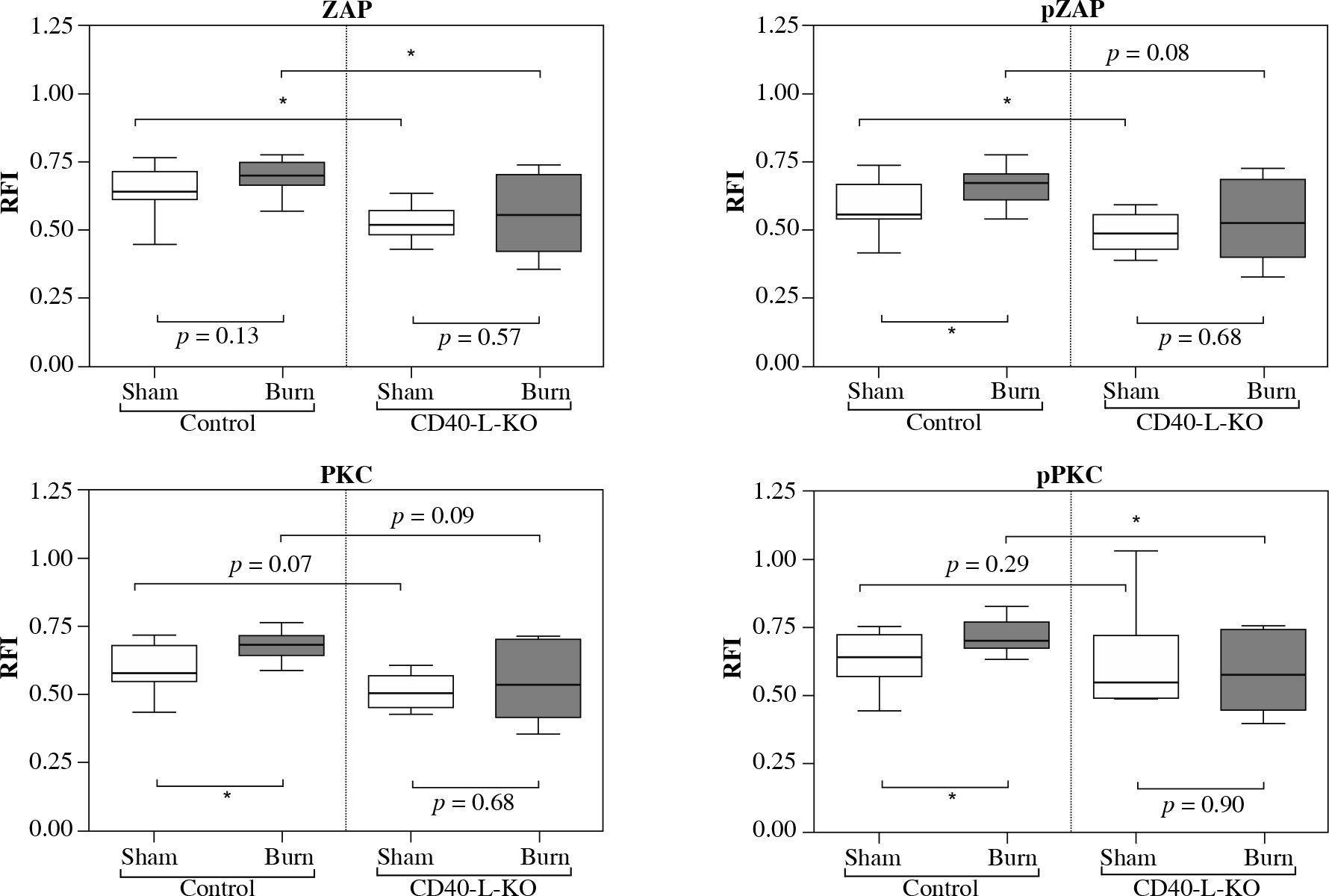 Comparing the results of fluorescence intensity measurement of CD4+ Tregs in the draining lymph nodes between a wild-type control and CD40L gene knockout (Fig. 2), we chose baseline activity (= CD4+ Treg activity of sham-treated animals) and posttraumatic activation as functional parameters of interest in the CD4+ Treg cells. We observed the baseline activity of lymph node derived CD4+ Tregs to be consistently lower for all tested signaling molecules in CD40L-KO-deficient compared to wild type animals with △ZAP-70: 0.12 (p < 0.05), △pZAP-70: 0.07 (p < 0.05), △PKC-δ: 0.07 (p = 0.07), △pPKC-δ: 0.09 (p = 0.29). In line with previous findings [10, 16, 17], we observed that trauma led to biologically significant posttraumatic activation of CD4+ Tregs in WT animals one hour after trauma. Of interest, here we were able to show for the first time that the posttraumatic activation is dampened in CD40L-KO animals with △ZAP-70: 0.04 (p = 0.57), △pZAP-70: 0.04 (p = 0.68), △PKC-δ: 0.03 (p = 0.68), △pPKC-δ: 0.02 (p = 0.9) when comparing the sham-treated group versus the burn-intervention group. Furthermore, the posttraumatic activity of CD4+ Tregs in CD40L deficiency settles at a significantly lower level of activity compared to WT animals, when disrupting CD40L-dependent signaling cascades, with △ZAP-70: 0.14 (p < 0.05), △pZAP-70: 0.15 (p = 0.08), △PKC-δ: 0.14 (p = 0.09), △pPKC-δ: 0.13 (p < 0.05).