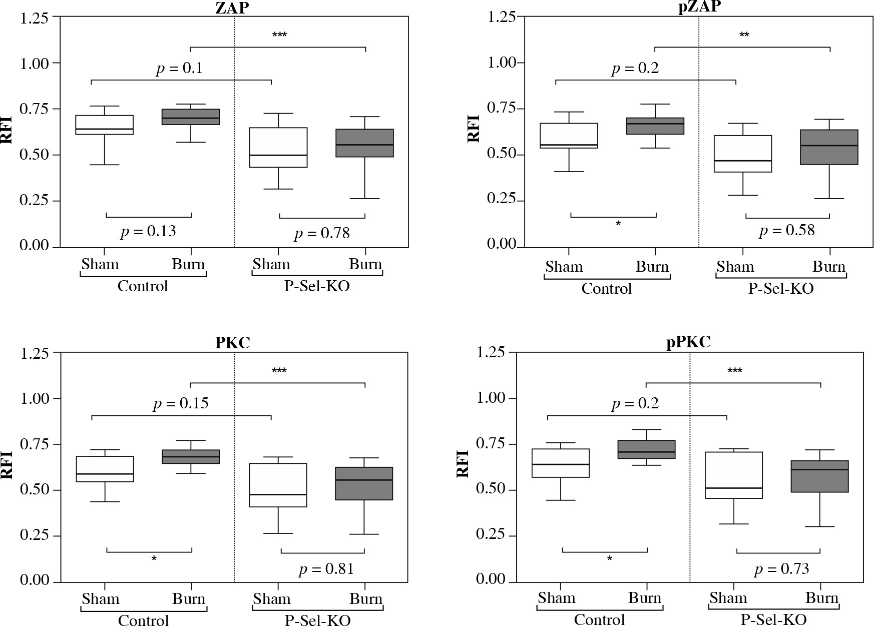 We observed the fluorescence intensity derived baseline activity of lymph node derived CD4+ Tregs to be consistently lower in P-selectin-KO animals than in WT animals for all tested signaling molecules, with △ZAP-70: 0.14 (p = 0.1), △pZAP-70: 0.09 (p = 0.2), △PKC-δ: 0.11 (p = 0.15), △pPKC-δ: 0.13 (p = 0.02). In contrast to the findings in WT animals, the posttraumatic activation is diminished in P-selectin-KO animals, comparing the sham-treated group with the burn-intervention group, resulting in △ZAP-70: 0.06 (p = 0.78), △pZAP-70: 0.08 (p = 0.58), △PKC-δ: 0.08 (p = 0.81), △pPKC-δ: 0.10 (p = 0.73). Furthermore, the posttraumatic activity of CD4+ Tregs in P-selectin deficiency settles at a significantly lower level of activity compared to WT animals when disrupting P-selectin-dependent signal cascades, with △ZAP-70: 0.20 (p < 0.001), △pZAP-70: 0.21 (p < 0.001), △PKC-δ: 0.21 (p < 0.001), △pPKC-δ: 0.20 (p < 0.001).