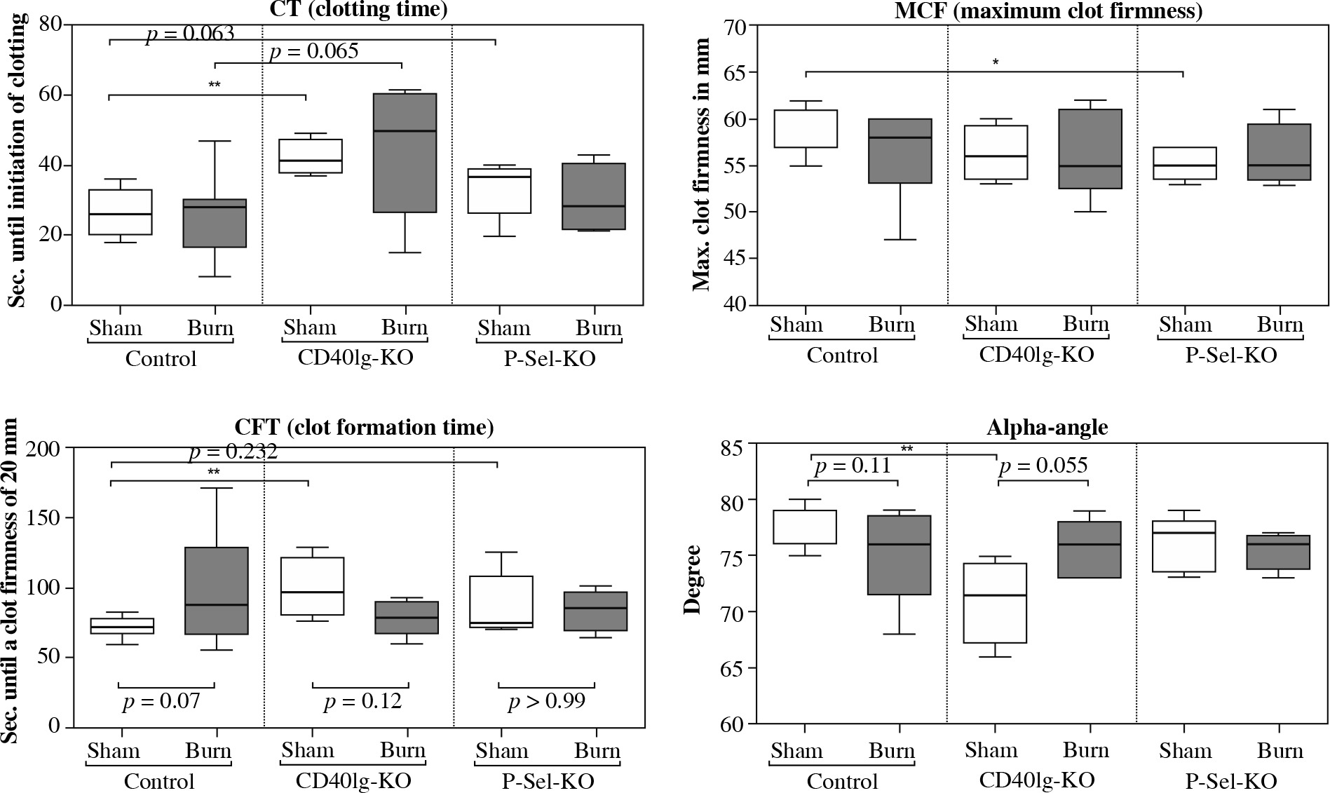 Rotational thromboelastometry (ROTEM delta) was performed on blood samples one hour following third degree burn injury using the EXTEM protocol to examine the effects of trauma on platelet activation and function. A male C57BL/6N WT control group was compared to a CD40L- and P-selectin-deficient group respectively, to clarify the mechanisms of the previously observed reciprocal posttraumatic activation of CD4+ Tregs and platelets.