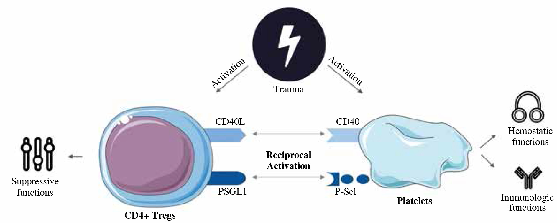 In conclusion, we described the role of direct cell-cell contact pathways in the interaction between CD4+ Tregs and platelets early after trauma for the first time (Fig. 5) [60]. Though immune perturbation is a relevant clinical problem in management of traumatized patients, the current concepts of immunosurveillance remain insufficient and lack the clear mechanistic understanding needed to derive actionable insight. Our study provides an insight into the role of direct cell-cell-contact-dependent mechanisms in the activation of posttraumatic immunologic players enabling a better understanding of parameters of interest in posttraumatic immunosurveillance. This marks a further step towards improved monitoring and tailored interventions that yield the potential for a more effective treatment of the complex pathological posttraumatic immune process. Furthermore, as an adequate hemostatic balance is considered crucial for the patients’ posttraumatic clinical outcome, our study provides a mechanistic understanding of the role of P-selectin and CD40L in platelet-dependent posttraumatic hemostasis. The impact of these pathways on hemostasis has to be considered when employing CD40L- and P-selectin-based immunomodulatory interventional strategies.