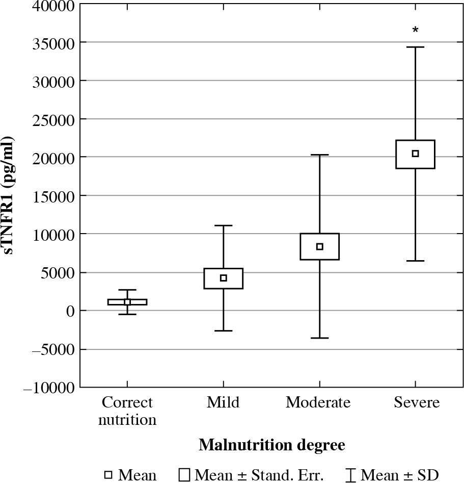 In the Kruskal-Wallis analysis regarding the distribution of protein concentrations in all compared groups, increased levels of sTNFR1 (p = 0.0000) were found (Fig. 1) together with the severity of malnutrition. For other proteins – TNF-α, IL-1Ra, IL-6, IL-10, sTLR4, MyD88, A20, HSP70, HMGB1 – no significant differences were found.