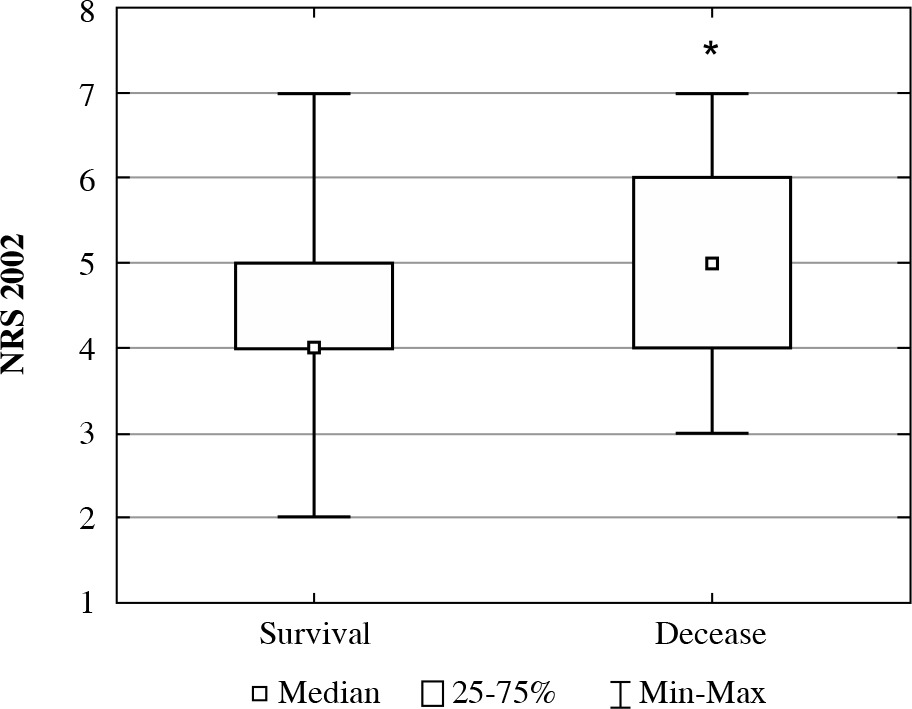 A correlation was noted between the malnutrition status (NRS 2002) and the APACHE II severity score scale (p = 0.0000, R = 0.3382). In the group of deaths, 8 (16%) cases with mild, 18 (36%) with moderate and 24 (48%) with severe malnutrition were reported. In the group of survivors there were 25 (22%) with mild, 51 (45%) with moderate and 37 (33%) with severe malnutrition. Death was significantly more frequent in the group of patients who received 5 or more points on the NRS 2002 scale (severe malnutrition) on the first day of hospitalization in the ICU (p = 0.0004) (Fig. 3).