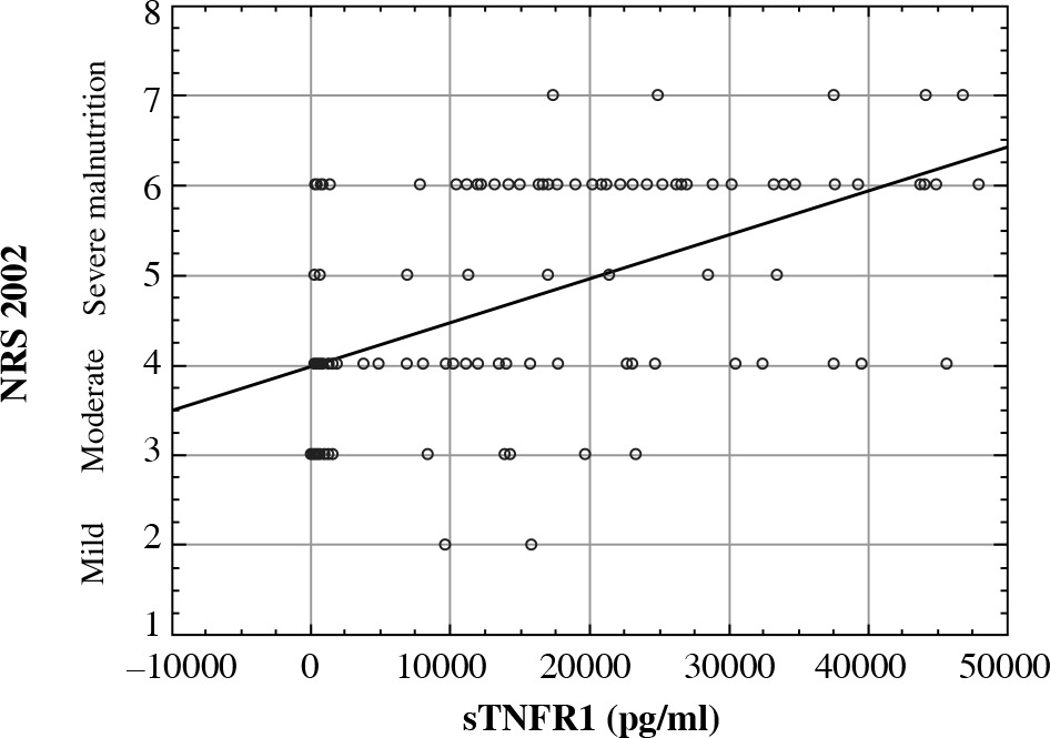 Correlation of nutritional status assessed using the NRS 2002 scale and sTNFR1 protein concentration (pg/ml) (p = 0.0000, R = 0.5442)