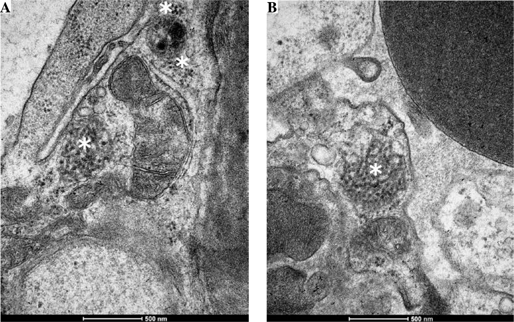 At the age of 14, a routine urinalysis showed proteinuria (0.4 g/l). Regular urine examinations performed for 6 months also showed proteinuria (0.4-1.1 g/l). To diagnose this condition, the patient was hospitalized in the Department of Pediatric Nephrology. On admission, physical examination revealed excessively developed subcutaneous tissue and stretch marks. The patient did not report any complaints. Laboratory tests are given in Table 1. She was positive for antinuclear antibodies (ANA); other autoantibodies were negative. Abdominal ultrasound showed normal size and echogenicity of the kidneys. The orthostatic test was negative. A diagnostic renal biopsy was performed to determine the cause of proteinuria. Light microscopy showed only the presence of C4d and IgG deposits around the glomerular capillary walls, which confirmed the diagnosis of membranous nephropathy. At the time when primary membranous nephropathy was suspected, tests for anti-PLA2R and anti-THSD7A antibodies were performed. However, they were negative. Tests for viral infections were also performed (hepatitis C virus [HCV], hepatitis B virus [HBV], Epstein-Barr virus [EBV], Cytomegalovirus [CMV]). They were suspected as potential pathogens causing secondary membranous nephropathy. However, the results were also negative. Ultrastructural examination of the renal biopsy showed changes in the structure of the capillary basement membrane in the form of thickening and an irregular contour. Electron dense subepithelial and mesangial deposits were found. In addition, many TRIs were observed in the endothelial cells of the vascular bundle (Fig. 1). They were detected in the cytoplasm and in the dilated cisternae of the endoplasmic reticulum. Single TRIs were also located in close proximity to subepithelial deposits. After obtaining these results, the criteria for lupus were met (depression as a sign of neuropsychiatric systemic lupus erythematosus (NPSLE), proteinuria, the presence of ANA, renal biopsy results) and appropriate treatment was provided. It included ramipril, steroids and cyclosporine A. Due to persistent psychiatric symptoms, steroid doses were reduced and steroid therapy was discontinued after 5 months. The treatment resulted in the resolution of proteinuria and normal renal function (estimated glomerular filtration rate [eGFR] 104 ml/min/1.73 m2). No proteinuria was found in the urine and the urine output was 0.12 g/24 h.