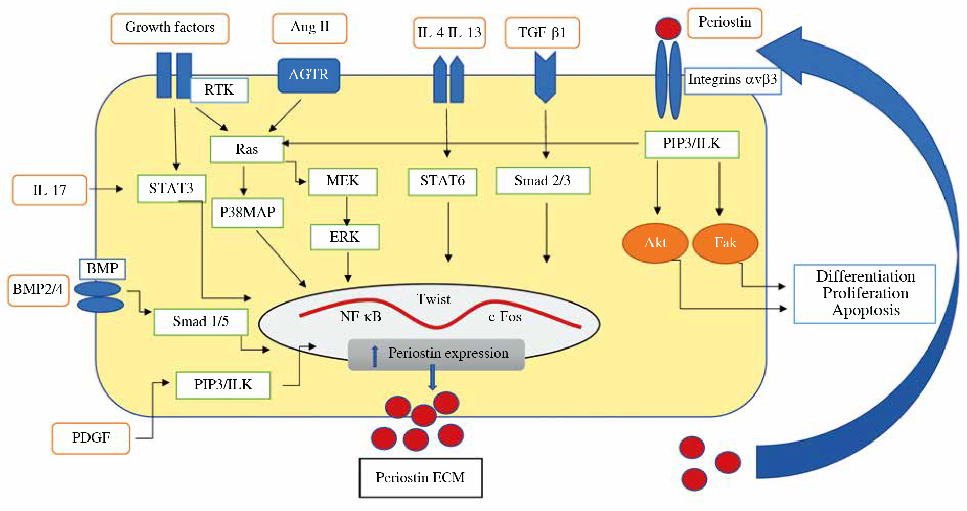 Expression of the periostin gene is under the control of numerous cytokines and hormones. The regulators of periostin expression include: TGF-β1, TGF-β2, TGF-β3, basic helix-loop-helix (bHLH) transcription factor, bone morphogenetic protein-2 (BMP-2) and BMP-4, platelet-derived growth factor (PDGF), vascular endothelial factor growth factor (VEGF), connective tissue growth factor-2 (CTGF-2), angiotensin II, interleukin (IL)-3, IL-4, IL-6, and IL-13 [19, 27] (Fig. 1).