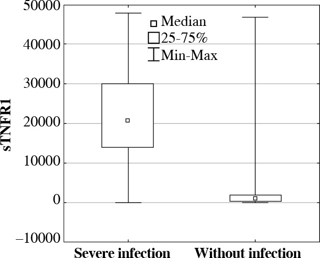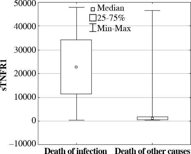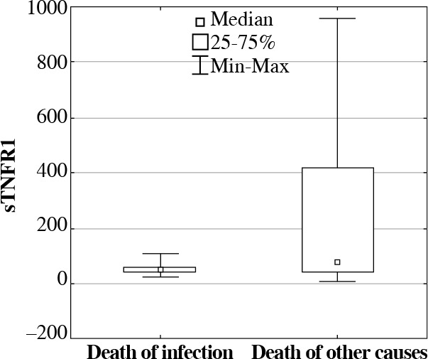 The soluble tumor necrosis factor receptor 1 (sTNFR1) serum concentrations (median, min-max, pg/ml) in ICU patients who deceased due to severe infections, in comparison with deceased patients due to other causes