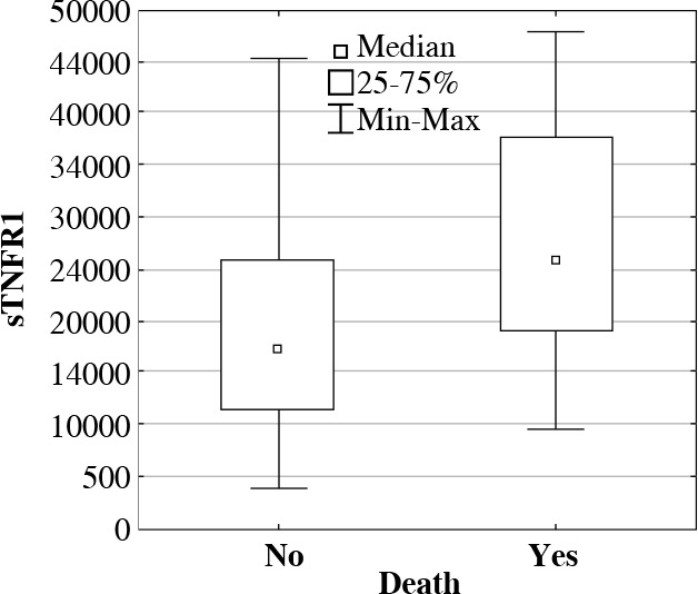 Moreover, it was observed that in the subgroup of deceased patients with severe infections, the level of protein sTNFR1 concentrations was significantly higher (26,114.80 pg/ml; p = 0.0342) compared with the group of septic patients who survived (20,232.00 pg/ml) (Fig. 6).