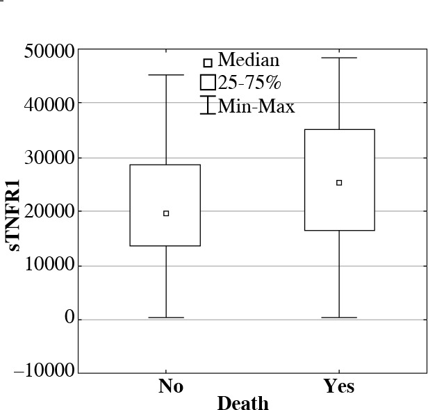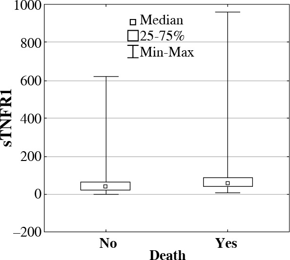 The soluble tumor necrosis factor receptor 1 (sTNFR1) serum concentrations (median, min-max, pg/ml) in ICU patients who survived or deceased during their treatment in ICU