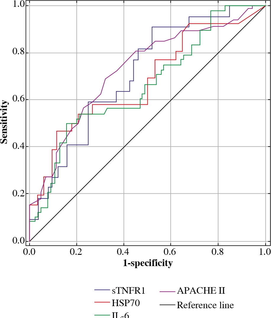 ROC curves for chosen parameters (APACHE II, sTNFR1, HSP70, IL-6, pg/ml) in the patients treated in ICU