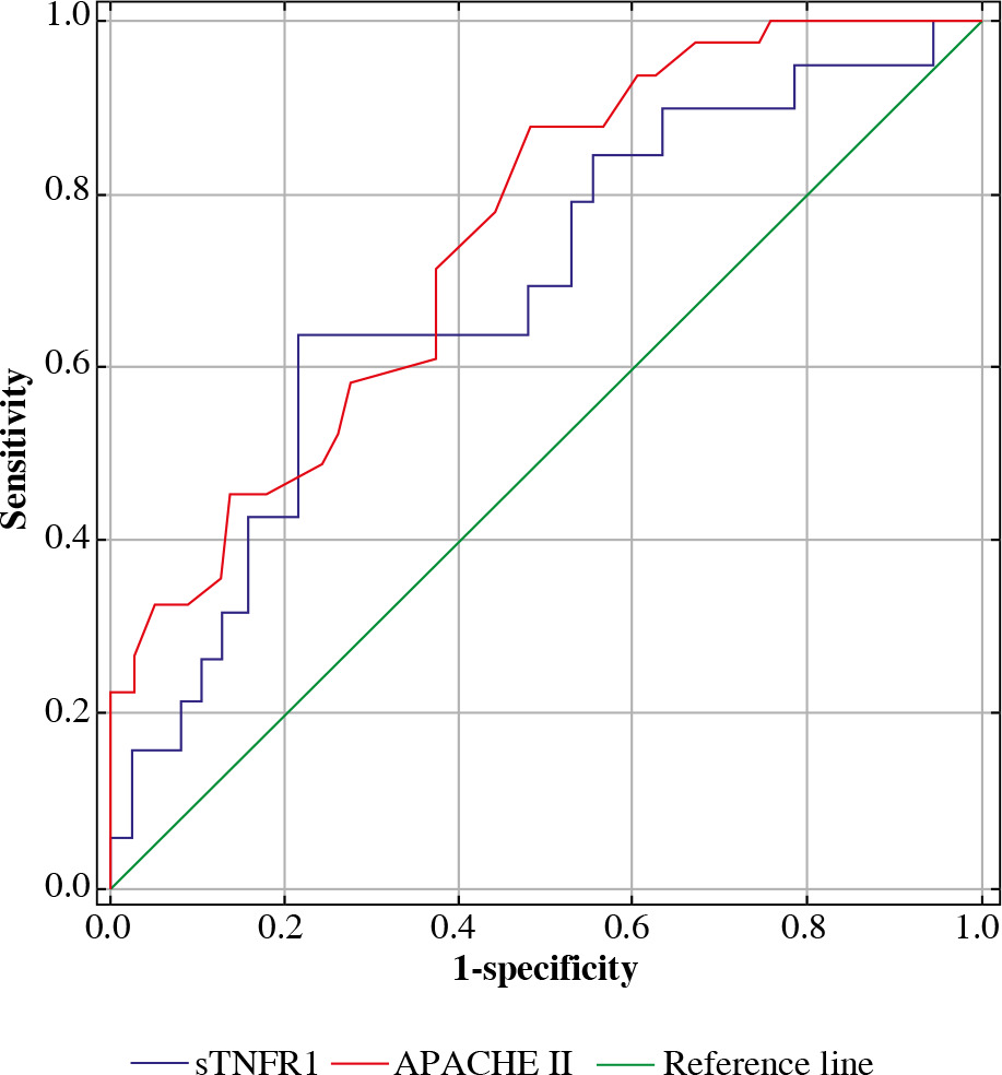 ROC curves for APACHE II and concentrations of sTNFR1 in the serum (pg/ml) of patients treated in ICU due to severe infections