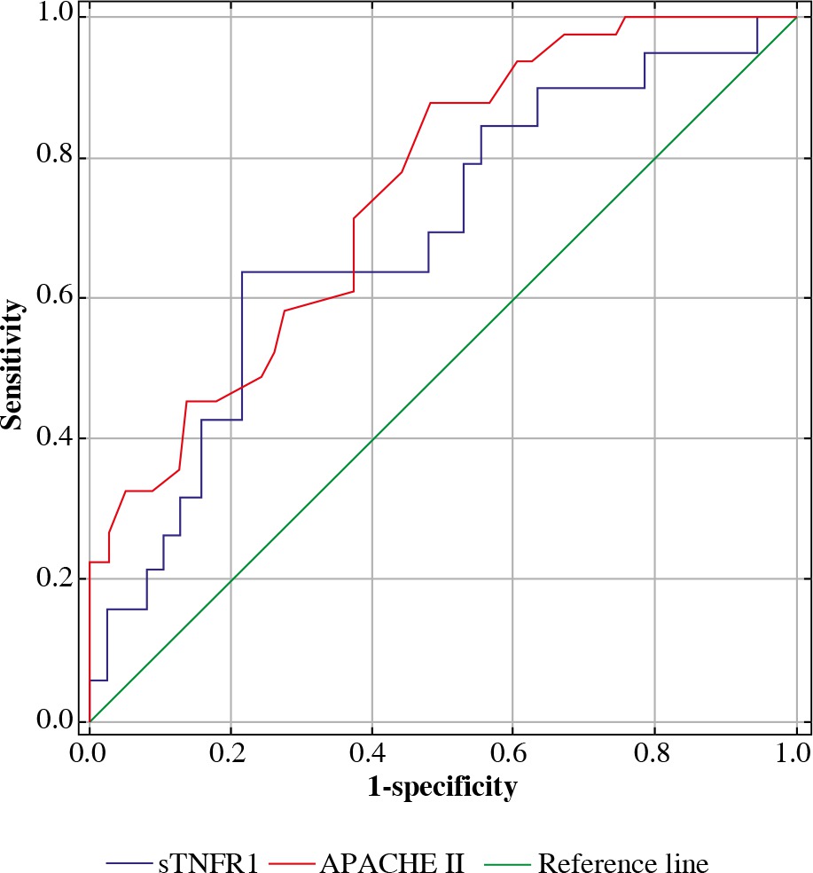 ROC curves for APACHE II and concentrations of sTNFR1 in the serum (pg/ml) of patients treated in ICU due to severe infections