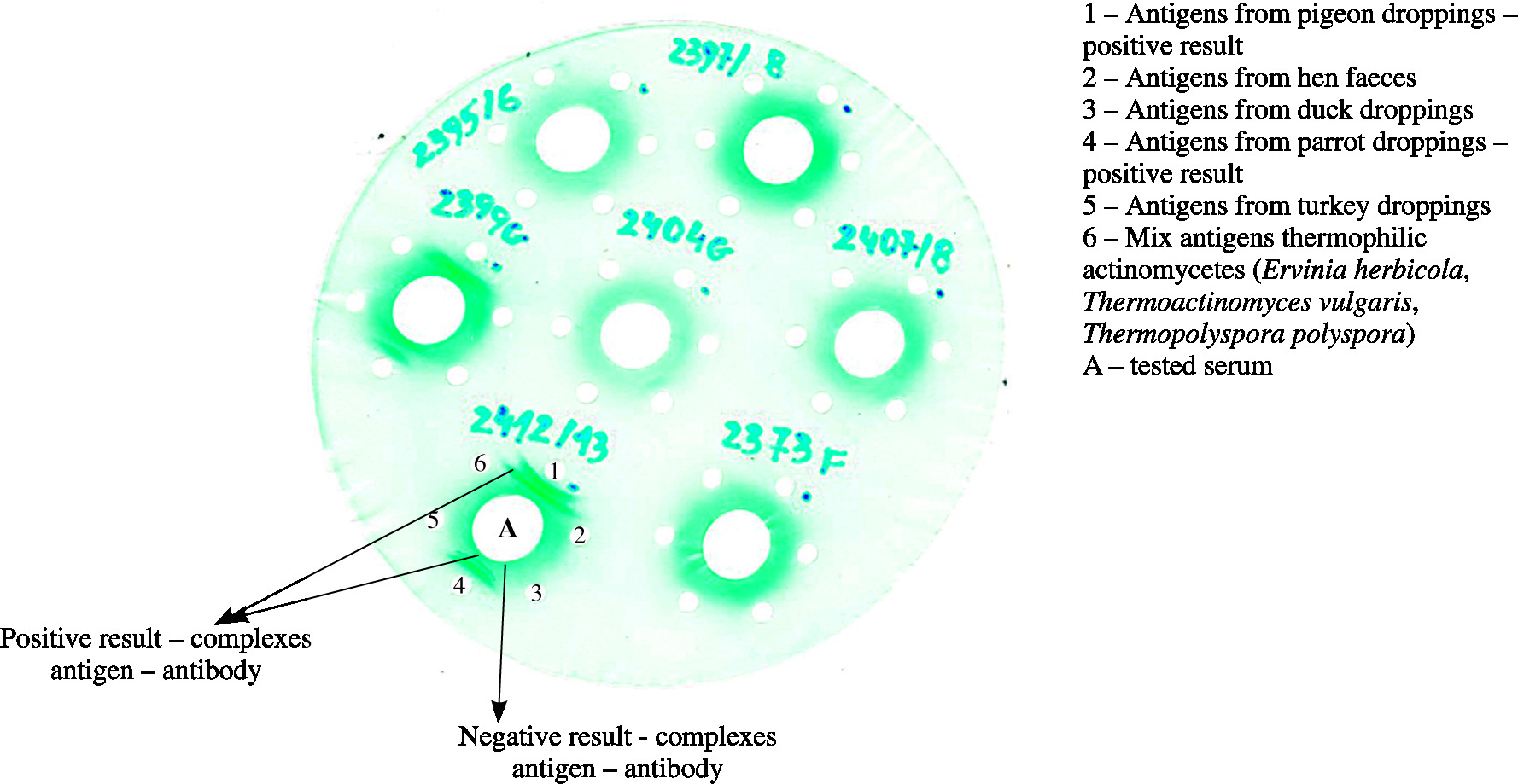Assessment of antibodies to various organic antigens was performed by double diffusion in agar gel using Ouchterlony method. Antigens of thermophilic actinomycetes (Ervinia herbicola, Thermoactinomyces vulgaris, Thermopolyspora polyspora) and protein antigens from birds’ droppings (pigeons, hens, ducks, parrots, turkeys) were applied to separate wells on agar gel located at a distance of 1 cm from the central well containing the tested serum. The plates were incubated for 5-7 days at 27°C, then washed in physiological saline solution for 6 days. Next, the agar gels were dried at room temperature for 48 hours and stained in 0.1% light green solution. The test results were read after 24 hours: positive result – visible precipitation lines (antigen-antibody complexes), negative result – no precipitation lines (Fig. 1). The results of precipitins serology were compared with the data concerning exposition.