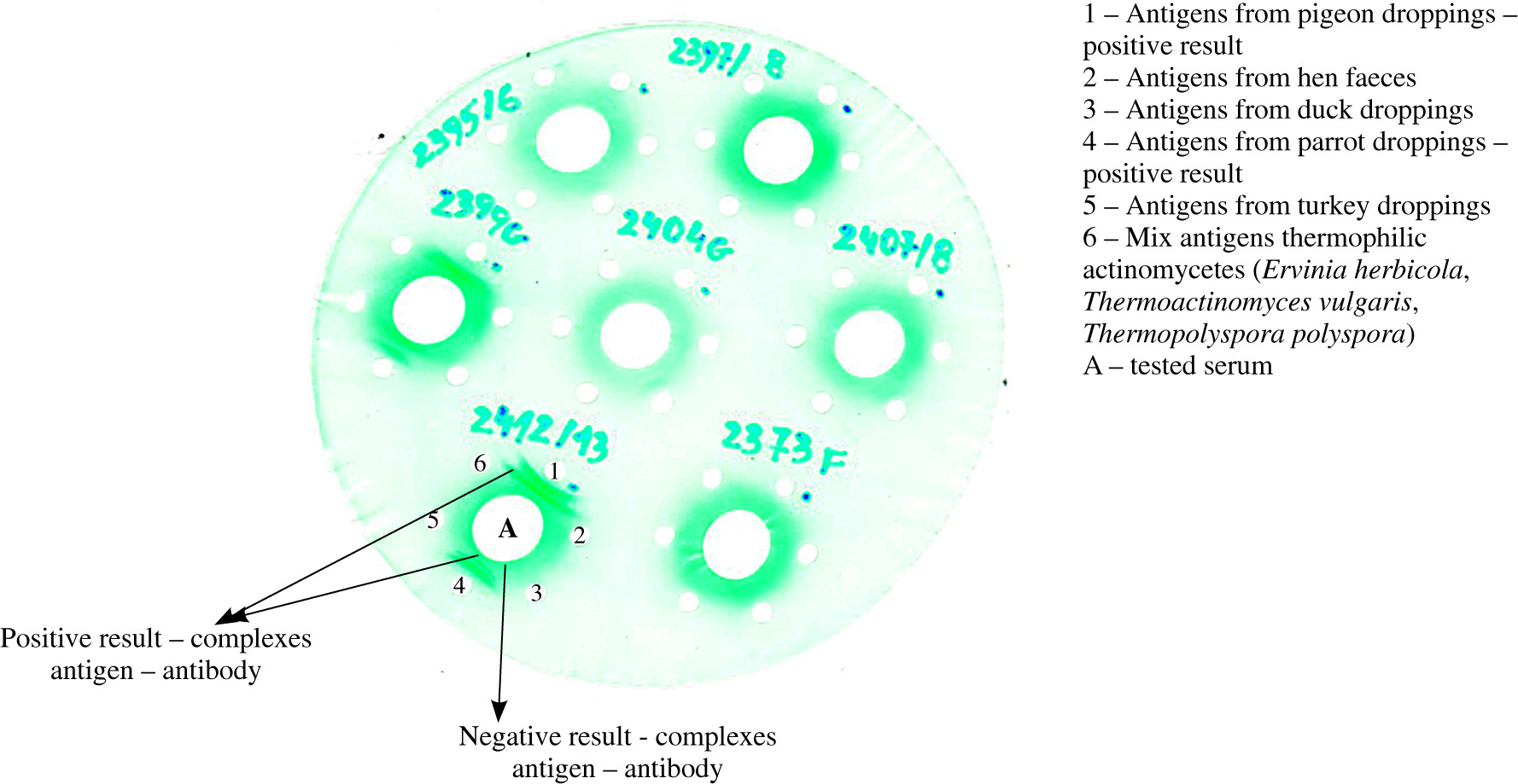 Assessment of antibodies to various organic antigens was performed by double diffusion in agar gel using Ouchterlony method. Antigens of thermophilic actinomycetes (Ervinia herbicola, Thermoactinomyces vulgaris, Thermopolyspora polyspora) and protein antigens from birds’ droppings (pigeons, hens, ducks, parrots, turkeys) were applied to separate wells on agar gel located at a distance of 1 cm from the central well containing the tested serum. The plates were incubated for 5-7 days at 27°C, then washed in physiological saline solution for 6 days. Next, the agar gels were dried at room temperature for 48 hours and stained in 0.1% light green solution. The test results were read after 24 hours: positive result – visible precipitation lines (antigen-antibody complexes), negative result – no precipitation lines (Fig. 1). The results of precipitins serology were compared with the data concerning exposition.