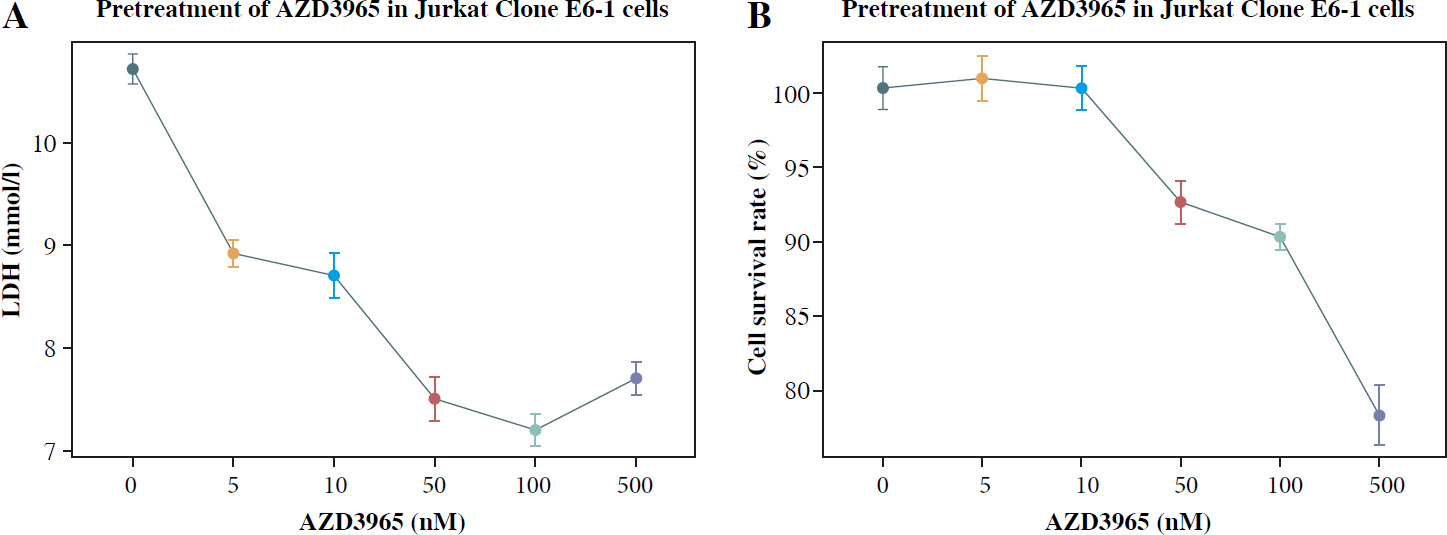 Cell proliferation was assessed by cell counting kit-8 (CCK-8) evaluation. Briefly, 1 × 105 Jurkat cells were seeded in 96-well plates and exposed to either DMSO (0.01%) or different concentrations of AZD3965 (0, 5, 10, 50, 100, and 500 nM) for 24 h. The numbers of cells in the wells were detected using the CCK-8 (Dojindo, Tokyo, Japan). Optical density (OD) values at 450 nm were detected using a Multiskan Go spectrophotometer (Thermo Fisher Scientific, USA).