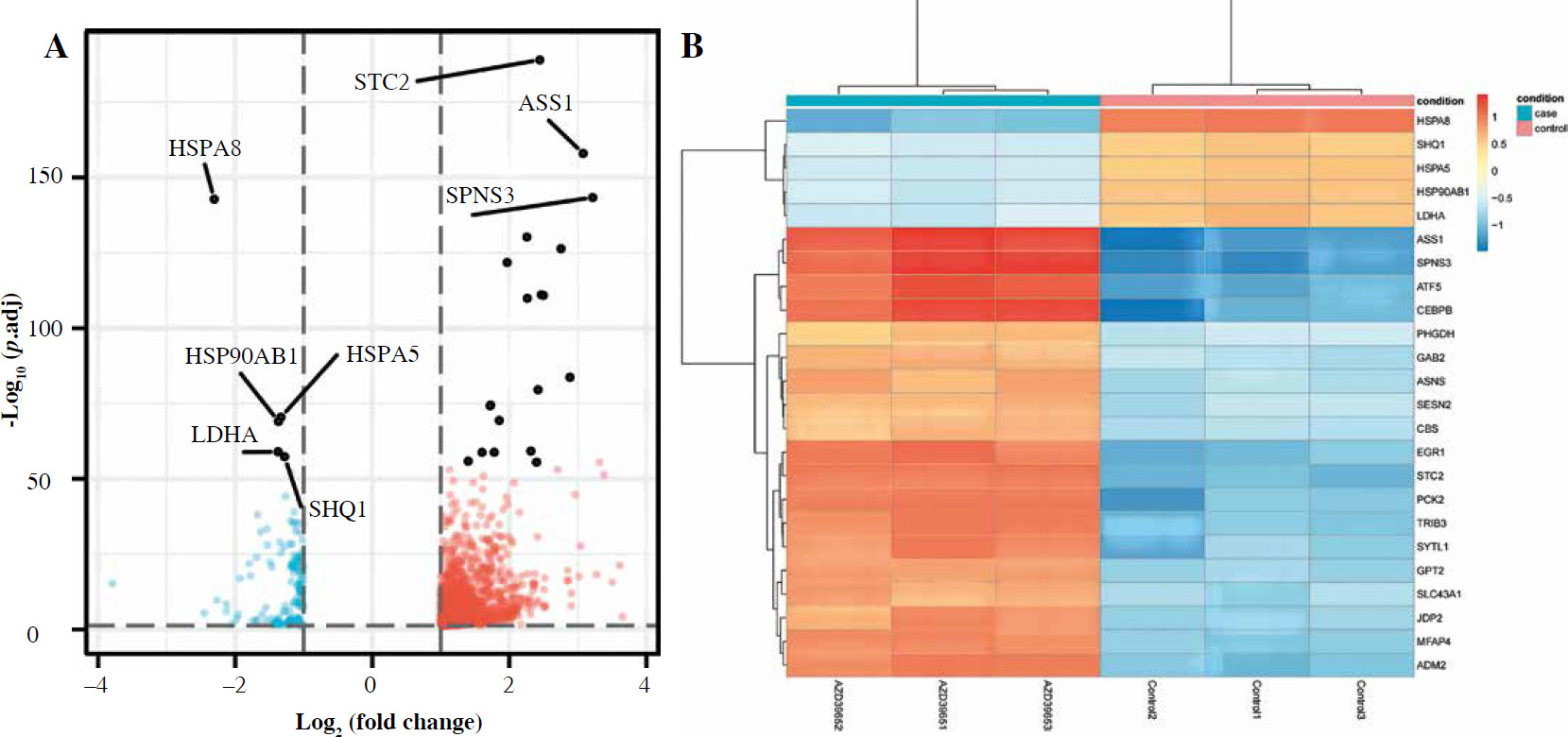 To gain insight into the molecular mechanism underlying the influence of anaerobic glycolysis on Jurkat T-cell proliferation, we conducted transcriptomic sequencing for Jurkat cells treated with or without AZD3965. This ana-lysis identified 1723 genes that were differently expressed with inhibition of anaerobic glycolysis by treatment with AZD3965 (Fig. 2A). Of these, 1460 genes were upregu-lated, including BBC3, SLC6A9, INHBC, BEST1, and HOXB9, and 263 genes were downregulated, including UTP14C, SNORA26, LNX1, and ZNF793 (Fig. 2B). Notably, genes of the heat shock protein (HSP) family, including HSPA8, HSPA5, HSPA1A, and HSPA1B, were also significantly downregulated (Fig. 2B).