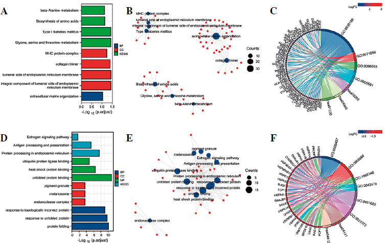 To further analyze the functional importance of the differentially expressed genes, we performed GO enrichment and KEGG pathway analyses (Fig. 3A, B). For the upre-gulated genes, the result of GO analysis showed enrichment for genes involved in extracellular matrix organization. These genes included members of the integrin family (ITGA2B, ITGA7, ITGB4, and ITGB7), collagen family (COL7A1, COL9A2, COL9A3, COL11A2, COL16A1 and others), and human leukocyte antigen (HLA) family (HLA-A, HLA-B, HLA-C, HLA-DQB1, HLA-E, HLA-F, SPPL2B and others) (Fig. 3C). Other genes were involved in the integral component of the endoplasmic reticulum lumen, collagen trimer, and major histocompatibility complex (MHC) protein complex (Fig. 3A, B). Notably, upregulated genes including integrin family members, DPP4, and SMPD3 served as inhibitors of cell proliferation. KEGG pathway enrichment analysis also revealed that the differentially expressed genes were mainly enriched in glycine, serine and threonine metabolism, type I diabetes mellitus, biosynthesis of amino acids, and beta-alanine metabolism (Fig. 3A, B). For the downregulated genes, GO analysis showed enrichment for genes involved in the response to unfolded protein, response to topologically incorrect protein, protein folding, and response to heat (Fig. 3D, E). KEGG pathway enrichment analysis also revealed that the differentially expressed genes were mainly enriched in protein processing in endoplasmic reticulum, antigen processing and presentation, the estrogen signaling pathway, and legionellosis (Fig. 3D, E). Notably, HSP family proteins (HSPA1A, HSPA1B, HSPA8, HSP90AA1, HSP90AB1, HSP90B1 etc.), which can promote cell proliferation, were significantly involved in these processes (Fig. 3F). These results indicate that inhibition of anaerobic glycolysis could impact protein metabolism, extracellular matrix organization, and the expression of genes involved in cell proliferation. Moreover, the estrogen signaling pathway was found to be potentially involved in this process.