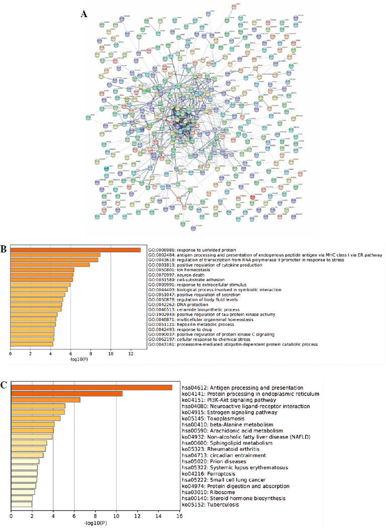To further analyze the functions of differentially expressed genes, PPI network analysis was performed. As shown in Figure 4A, many hub genes, including HSP family protein genes, ERBB2, UBC, DNAJB1, and NME1-NME2, were identified. To further clarify the functions of these hub genes, GO and KEGG pathway analyses of these genes were performed. The results also showed they were mainly involved in the response to unfolded protein, response to topologically incorrect protein, and protein folding (Fig. 4B). KEGG pathway enrichment analysis also revealed that these hub genes were mainly enriched in antigen processing and presentation, protein processing in endoplasmic reticulum, the PI3K-Akt signaling pathway, neuroactive ligand–receptor interaction, and the estrogen signaling pathway (Fig. 4C).