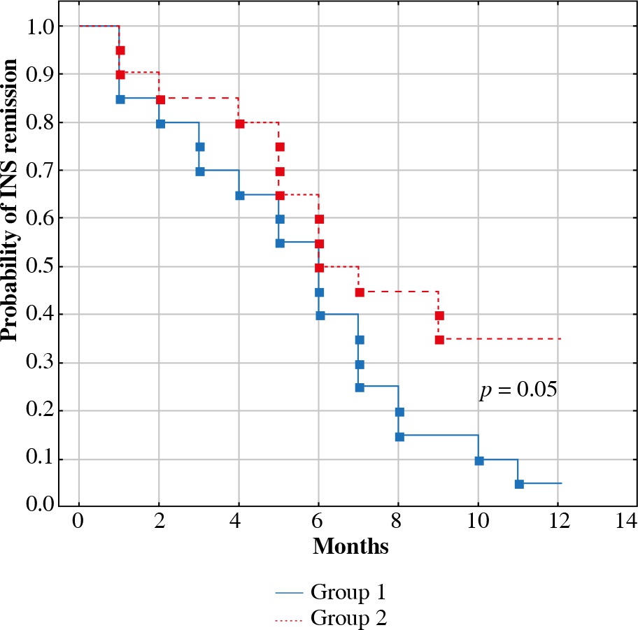 The results obtained were statistically analyzed using Dell Statistica 13.0 PL (TIBCO Software Inc., Palo Alto, CA, USA). Normality of data sets was established with the Shapiro-Wilk test. All data were presented as mean ±standard deviation and interquartile range. The differences between normally distributed data were evaluated using Student’s t-test, and between non-normally distributed data using the Mann-Whitney U test and Wilcoxon test. The number of patients in both groups was compared using Fisher’s exact test. The relations between quantitative variables were analyzed using Pearson correlation or Spearman’s rank correlation, when appropriate. Kaplan-Meier analysis and the log-rank test were used to compare one-year risk of INS relapse in two groups. A p-value < 0.05 was considered statistically significant.
