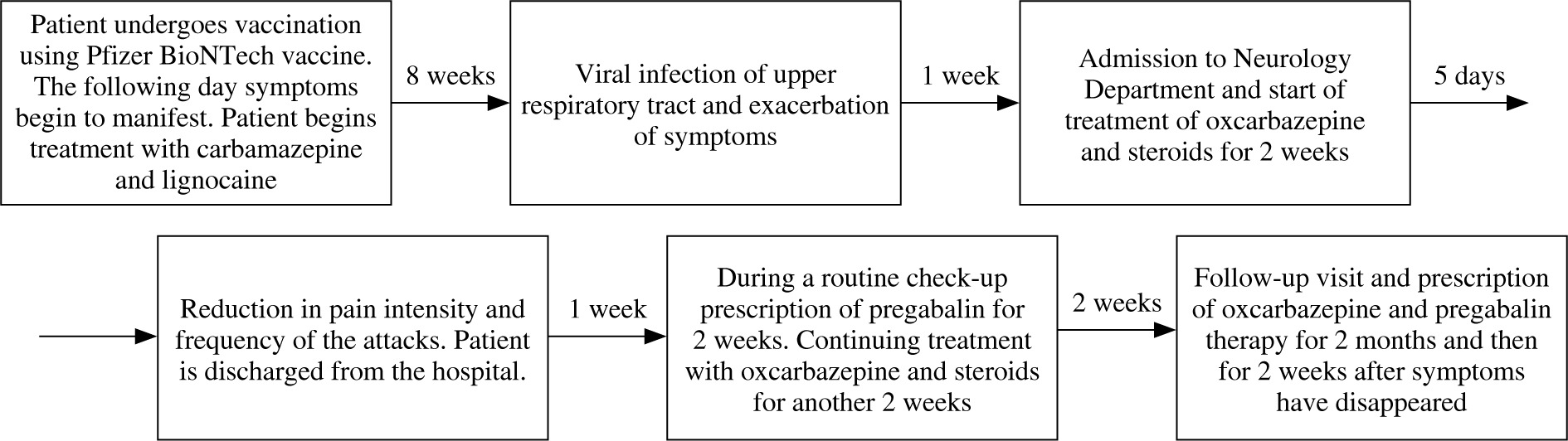 The new treatment was instituted with replacement of carbamazepine by oxcarbazepine 600 mg twice a day and introducing steroids based on a previous scientific report [3] encountered during our research following the patient’s interview. Our case matched one description very well and, as such, with the patient’s cooperation, therapy based on the reported findings commenced. Steroids were given in the form of dexamethasone 12 mg per day for two weeks and titrating doses during the following two weeks. After combined therapy employing steroids with oxcarbazepine, a reduction both in pain intensity and in frequency of attacks was observed within five days. Because the pain was still present, the treatment was further supplemented with pregabalin in the dose of 150 mg per day for two weeks and was continued for the next two months. Gradually, but with transient periods of weak exacerbation, pain alleviation was achieved and the patient made a full recovery. Treatment with oxcarbazepine and pregabalin was continued for two further weeks. Six months after the onset of the disorder the patient remains without pain. Treatment was officially declared complete in May 2022 (Fig. 1).
